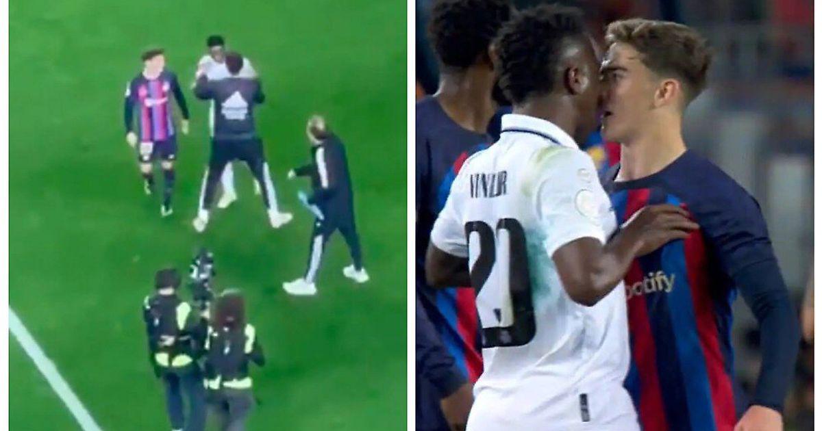 Когда судья дал свисток на перерыв, а команды потянулись к подтрибунке, Винисиус и Гави вновь встретились. Между футболистами снова произошла стычка, игроков пришлось разнимать. Фанату удалось запечатлеть эпизод с трибун «Камп Ноу».