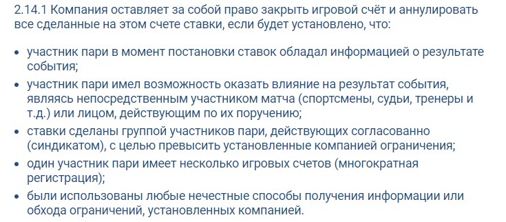 - заключение пари на договорные матчи. Сюда относятся клиенты, которые на момент заключения пари имели информацию о конечном результате или возможность оказать на него влияние, а также клиенты, которые использовали любые нечестные способы получения информации или обхода ограничений БК (пункт правил 2.14.1);