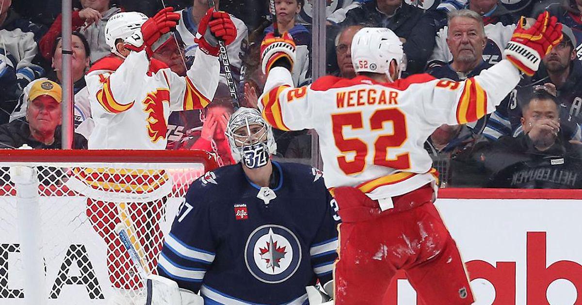 "Виннипег Джетс"-"Калгари Флэймз" 1:3.Никита Задоров и Эндрю Манджиапане набрали по 2 очка (1+1),Якоб Маркстрём отразил 34 броска.
