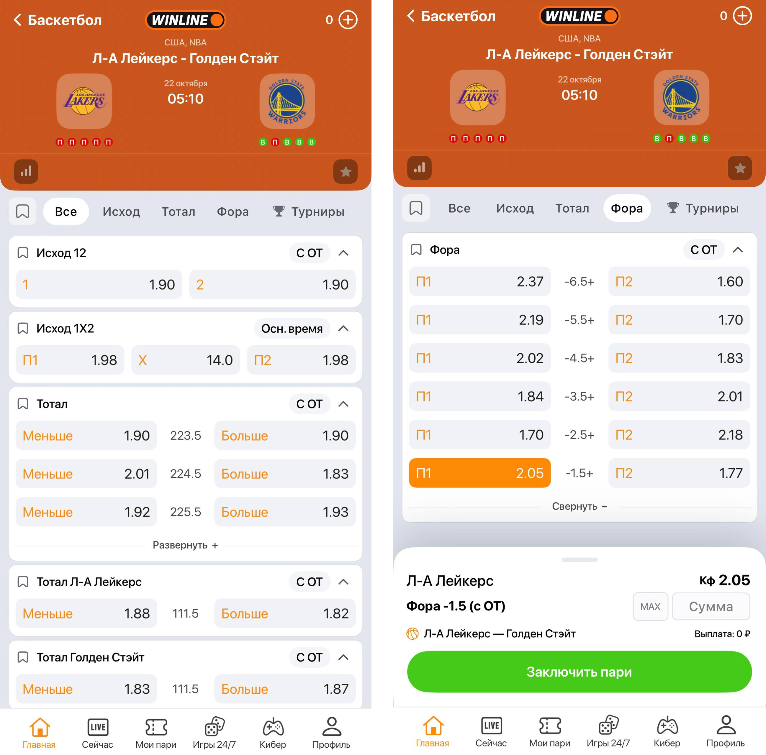 Поскольку в баскетболе разрывы в счете обычно большие, то и ставки с форой (1,5) в линии предлагаются в противостояниях относительно равных клубов. Например, товарищеский матч «Лейкерс» – «Голден Стэйт». Есть и форы (-1,5) и (+1,5) на каждую из команд. Коэффициенты играбельные как при ставке на хозяев, так и при ставке на гостей.