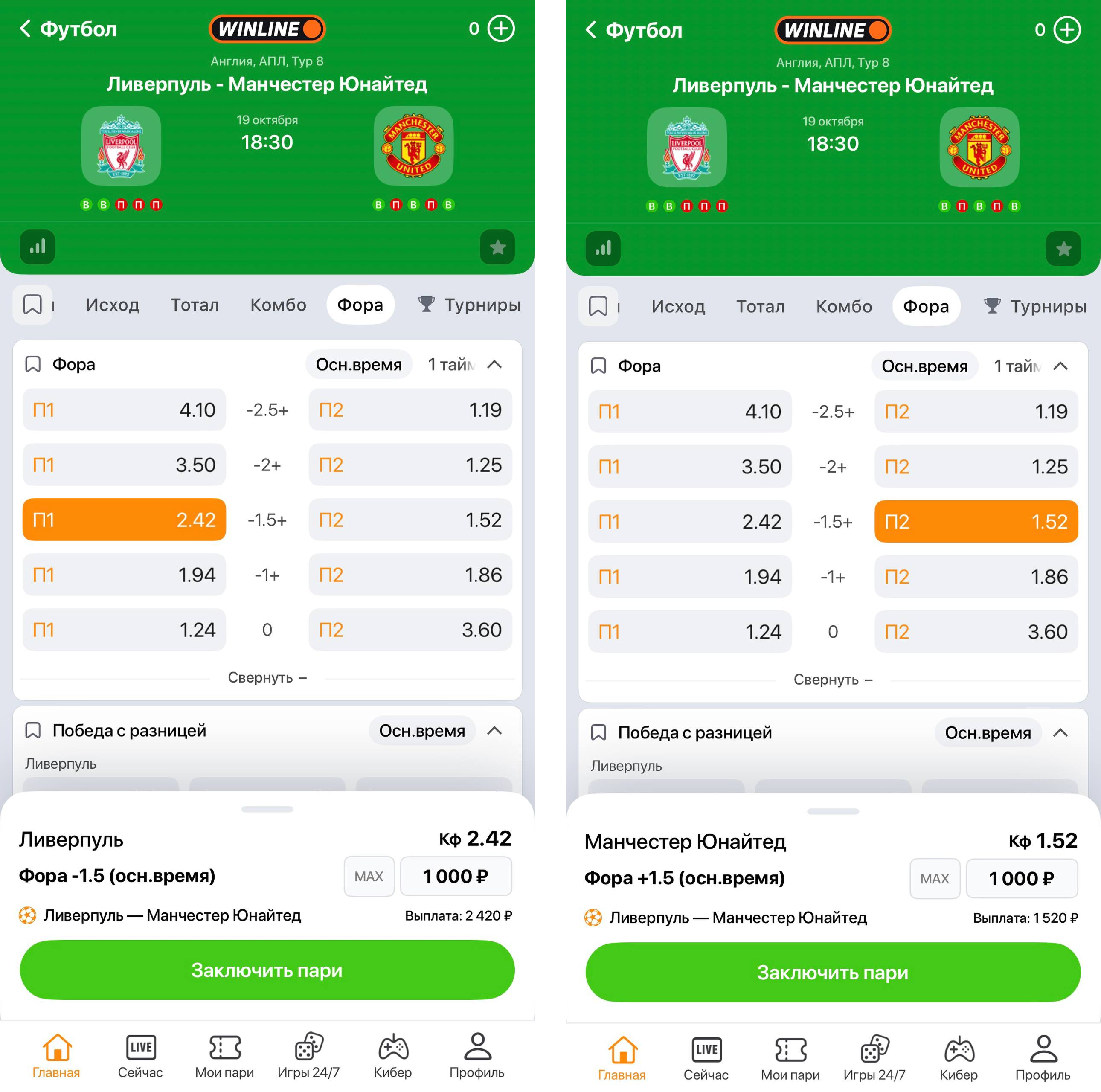 Ставка на классическую фору (1,5) по голам в матче «Ливерпуль» – «Манчестер Юнайтед» . Так как хозяева – предполагаемый фаворит встречи, то на него предлагается фора (-1,5) за коэффициент 2.42 а на «МЮ» – (+1,5) за 1.52. Если вы уверены в победе «Ливерпуля» в 2 и более голов, ваш выбор – минусовая фора на хозяев. Если же вы считаете, что гости окажут серьезное сопротивление, ставьте (+1,5) на «Манчестер Юнайтед» за неплохой коэффициент.