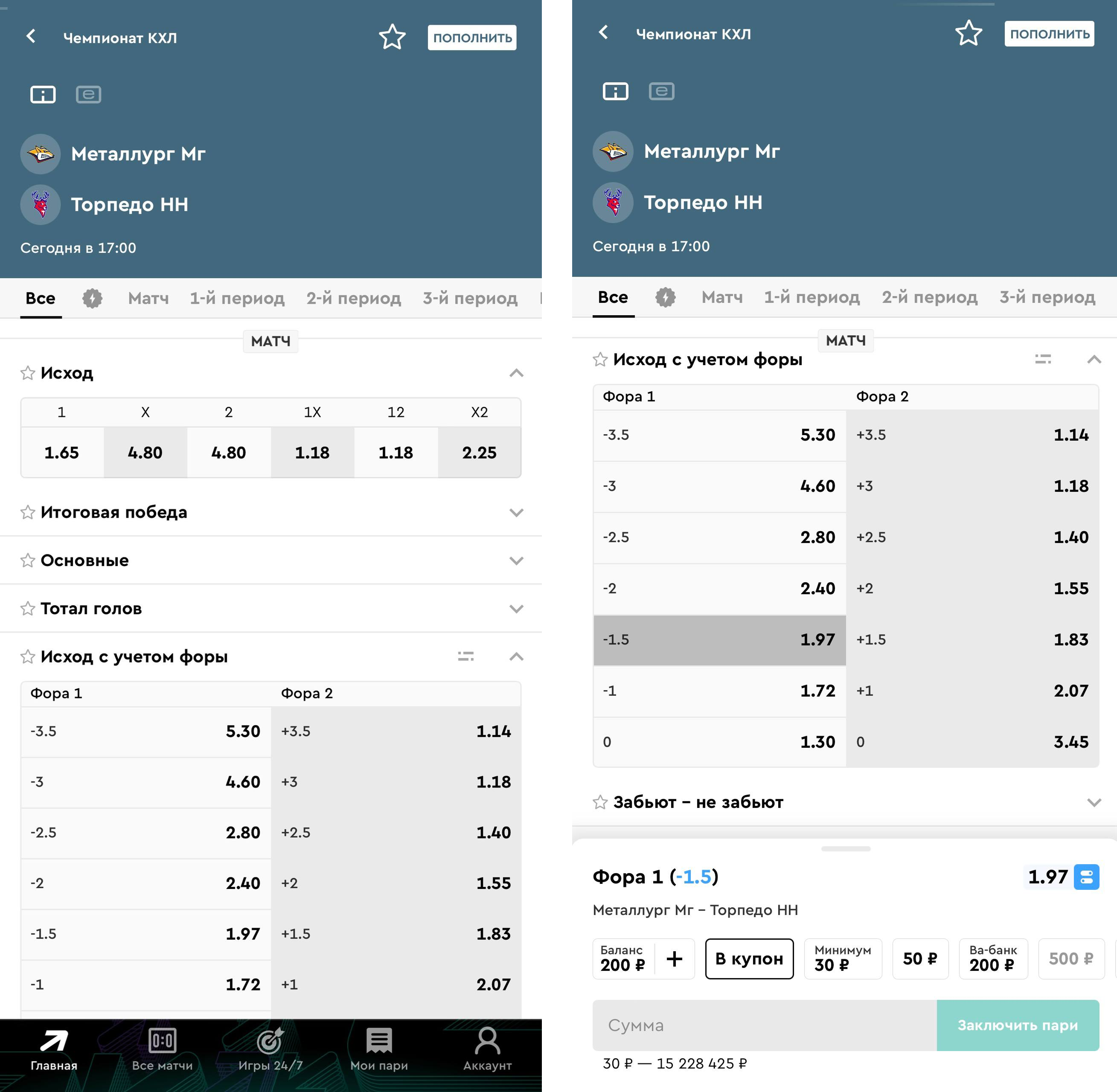 Матч КХЛ «Металлург» – «Торпедо». В росписи есть ставки с форой (-1,5) и (+1,5) на обе команды, но хозяева – очевидные фавориты встречи, так что на их минусовую фору предлагается коэффициент 1.97.