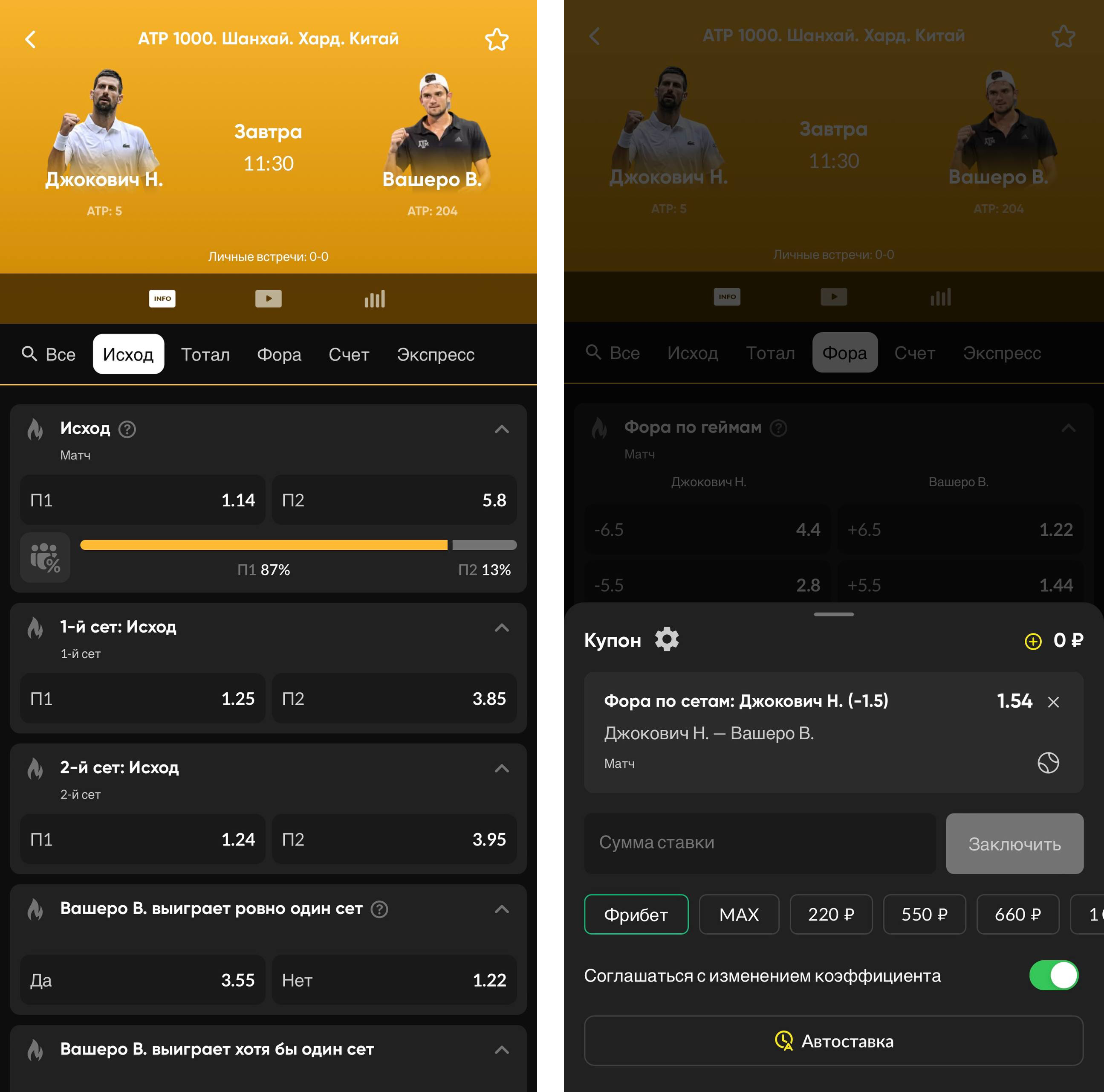 Встреча Новака Джоковича и Валентина Вашеро. Сербский теннисист с большей долей вероятности должен обыграть представителя Монако. Предположим, что матч завершится в двух сетах победой Джоковича поэтому выбираем фора 2 (-1,5) по сетам за коэффициент 1.54. Для прохода ставки необходимо, чтобы Джокович выиграл матч со счетом 2:0, конкретный счет в каждом из сетов не имеет значения для выбранной ставки. Например, матч закончился в пользу Джоковича со счетом 7:6, 6:4. Следовательно, ставка сыграла. Если же вы выберете фору 1 по сетам (+1,5) за 2.44, это означает, что у Вашеро должно быть в итоговом протоколе хотя бы один выигранный сет.