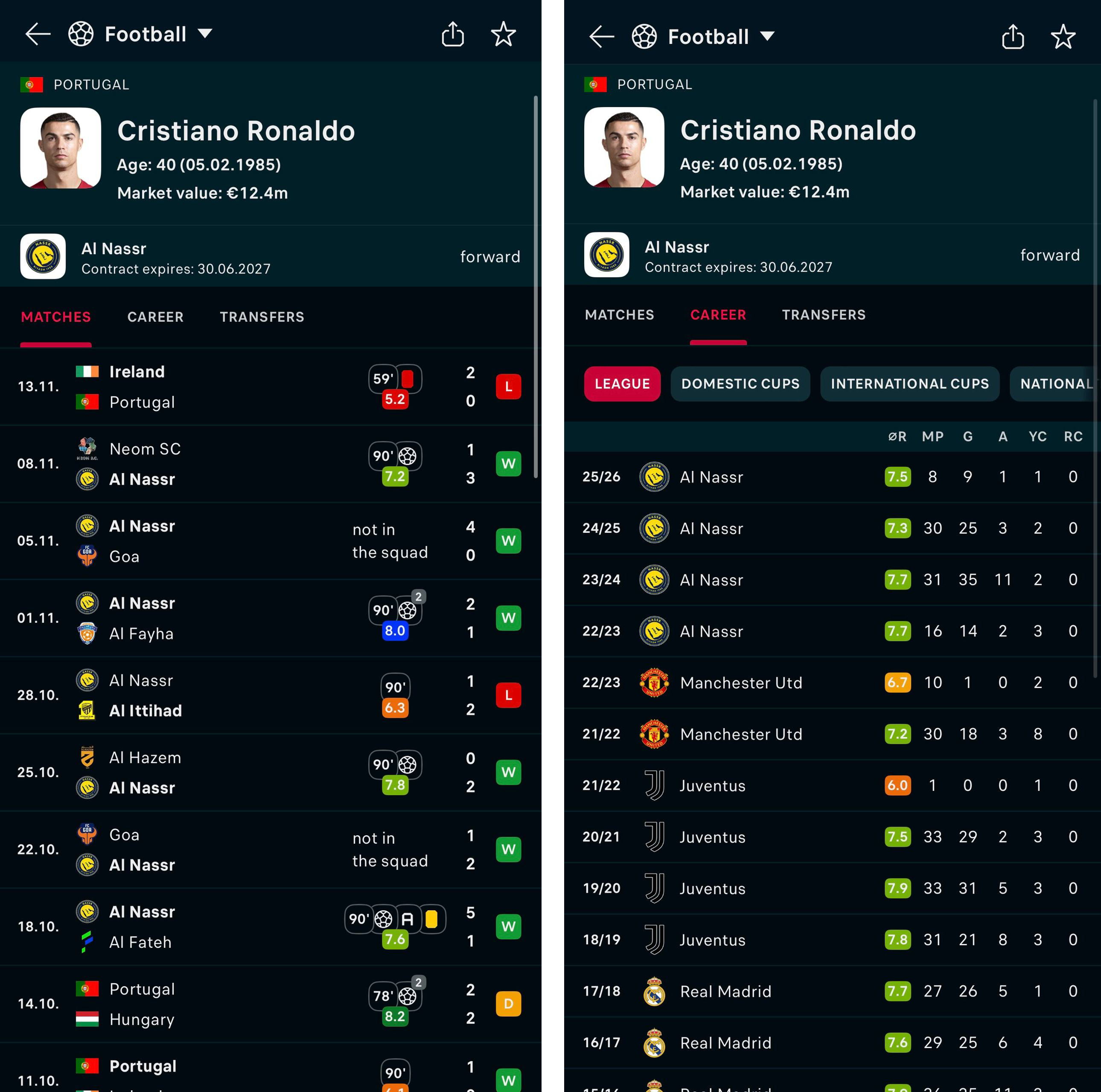 Еще ниже – раздел «Карьера». Здесь можно увидеть выступления игрока за всю его карьеру. Есть разбивка по турнирам, в отдельной вкладке – статистика за сборную.