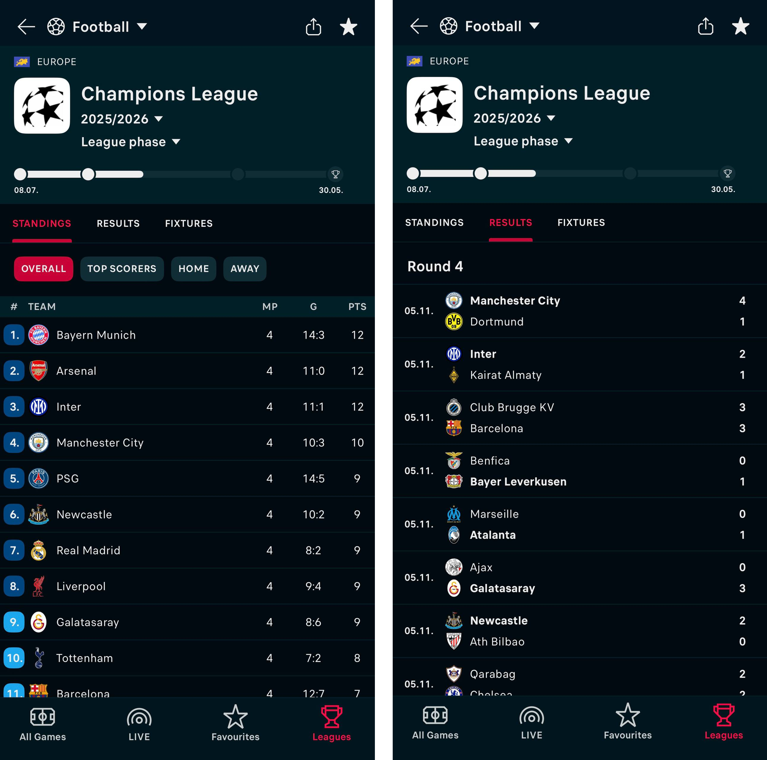 - турнирная таблица в режиме Live;
