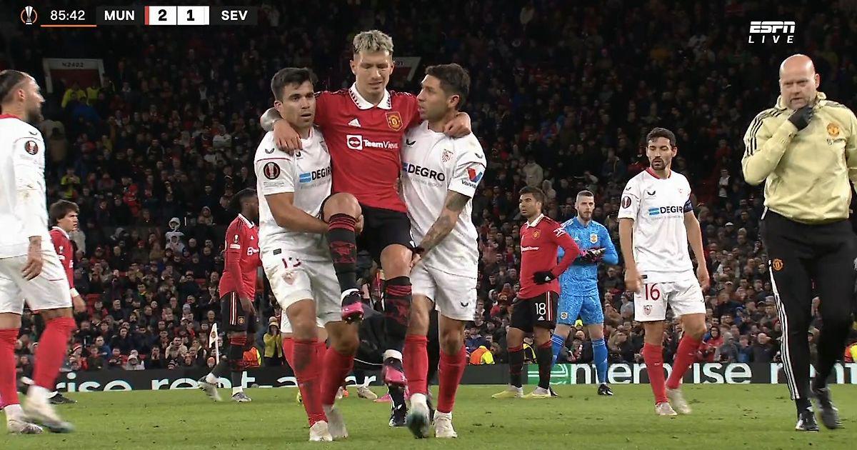 Лисандро не мог наступать на ногу. Аргентинцы из «Севильи» Маркос Акунья и Гонсало Монтьель вынесли футболиста «Манчестер Юнайтед» за поле.