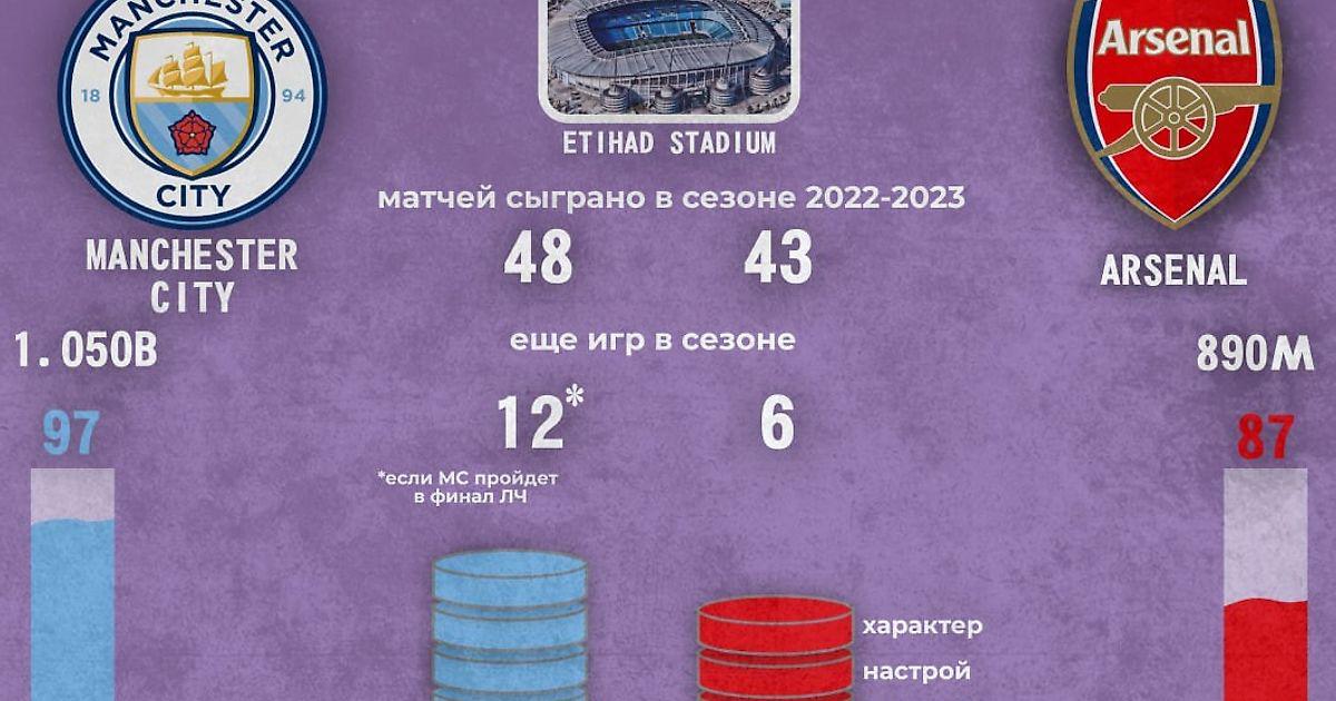 3. Настрой. Манчестер так привык к победам в чемпионате, что для них это обыденность. Они снова в одном шаге от чемпионства, которых было при Гвардиоле аж четыре. И это в самой сильной лиге Европы. Для игроков Арсенала, которые ни разу не брали в руки этот заветный кубок, наступает самый ответственный момент, матч, в котором нужно решать, матч, в котором нужно выкладываться на 146%. Понимают ли футболисты это? Я полагаю, что очень даже понимают. Хватит ли у них характера, не уверен, но очень бы хотелось увидеть запредельный настрой, с которым они будут идти вперед. Игроки Арсенала должны понимать, что для них это финал, у них не будет другого шанса, нужно решать все в этот вечер, где каждая травинка идеально подстриженного газона Этихада будет против них. Отдам очко в пользу «канониров», итого 2-1.