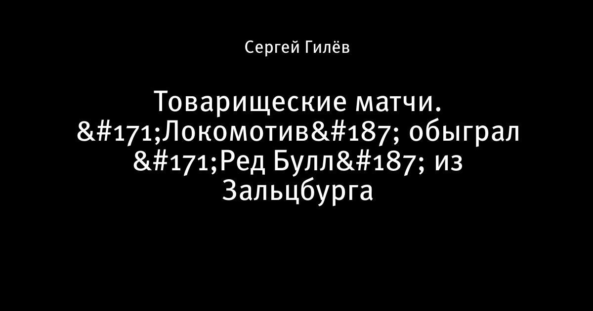 30 июня 2009, 14:26 Товарищеские матчи. «Локомотив» обыграл «Ред Булл» из Зальцбурга Голы Сычева и Гатагова.Ред Булл Зальцбург Австрия Локомотив Россия 0:2 0:1 Сычев (44), 0:2 Гатагов (67) Автор Сергей Гилёв Этот пост опубликован в блоге на Трибуне Sports.ru. Присоединяйтесь к крупнейшему сообществу спортивных болельщиков! Другие посты блога Разборки в олимпийском Париже