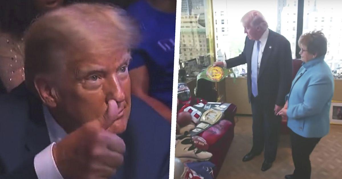 Трамп сказал: «Есть разные вещи. Шлем Супербоула Тома Брэди, пояс Майка Тайсона...это от Винса Макмэна из WWE. Это обувь Шакила О’Нила. Прямо здесь, это крутые кроссовки. Настоящие. Он снял их после игры и передал мне. Смотрите, какая огромная у него нога!