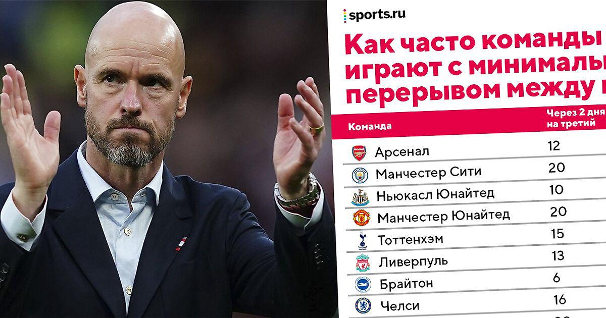 У команды тен Хага действительно непростое расписание. Мы посчитали, сколько раз команды АПЛ в этом сезоне играли в режиме «через два дня на третий» – у «МЮ» набралось 20 таких матчей.