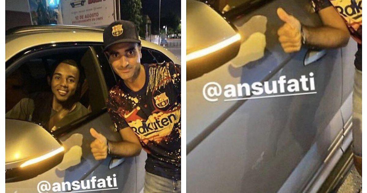 На фото крайне довольный собой и важностью момента болельщик «Барселоны» и игрок «Барселоны» за рулем автомобиля - фанат распознал в нем Ансу Фати.