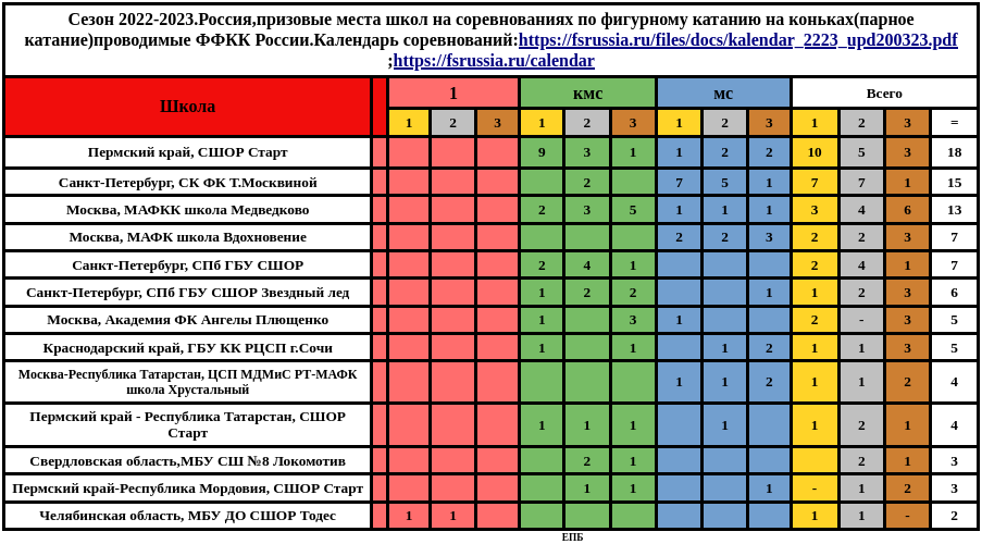 Сезон 2022-2023.Роcсия,призовые места школ на соревнованиях по фигурному катанию на коньках(парное катание)