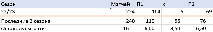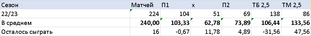 Дальше я решил посчитать, а сколько осталось добрать исходов текущему сезону, до средних значений предыдущих?! Ведь это важно, так как выборка по историческим данным большая, бывает что сезоны отличаются друг от друга, но история обычно не ошибается никогда.