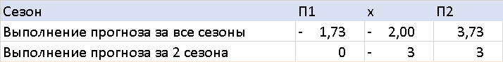 1. Исход П1 играется на 1,73 матча меньше прогнозируемого, если считать последние 9 сезонов и играется точь в точь, как прогнозирует исход за последние 2 сезона.