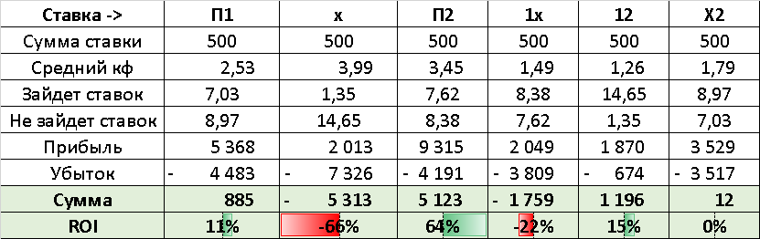 Итого, получилось у меня что П1 будет сыгран 7,03 матча, Х на 1,35 матча и П2 на 7,62 матча.