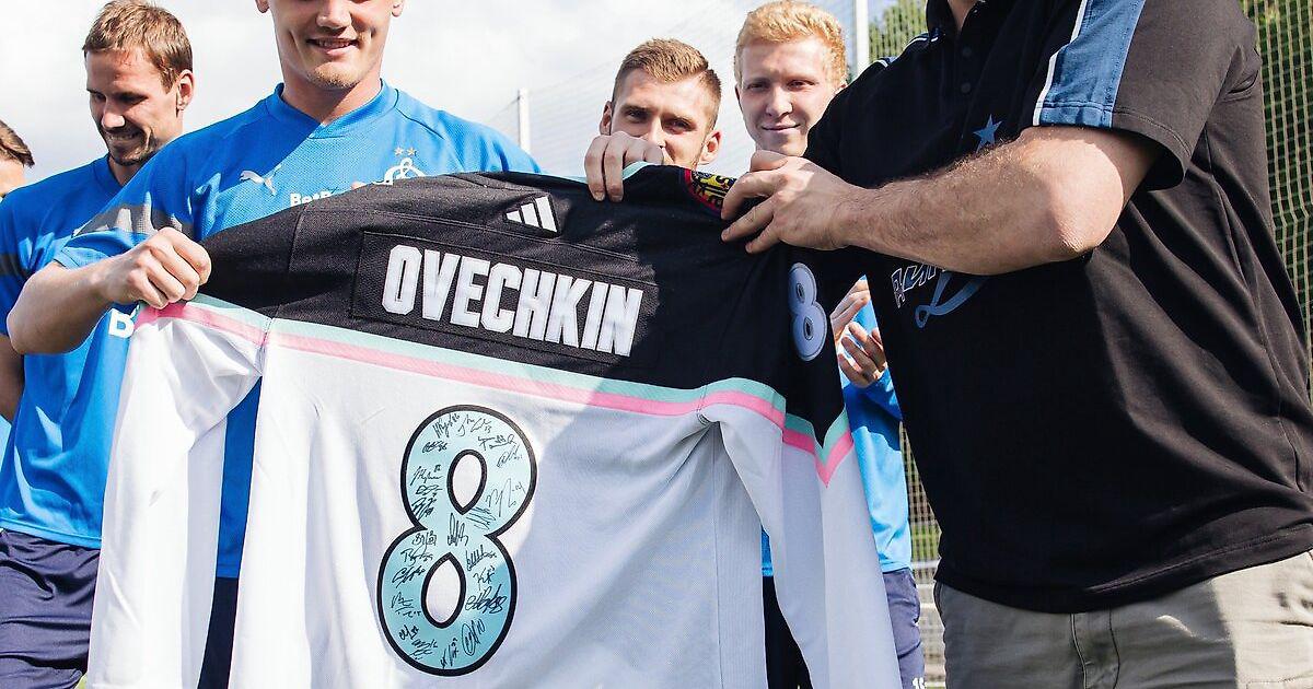 «Удачи в следующей игре с «Локомотивом». Будем болеть», – пожелал футболистам Овечкин, передавая игровую майку с восьмым номером нападающему «Динамо».