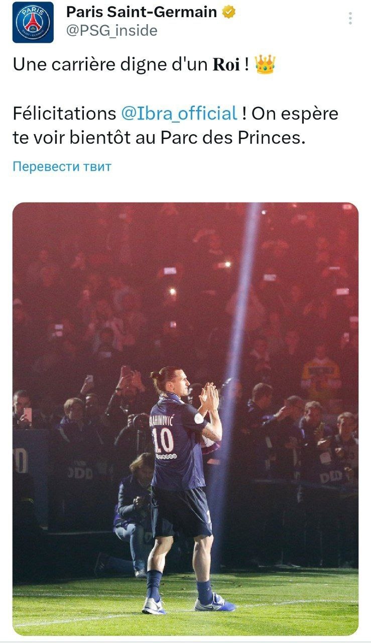 В «ПСЖ» не могли не отреагировать прощание Ибрагимовича с профессиональным футболом – клуб поздравил шведа с карьерой, достойной короля и выразил надежду на скорую встречу на «Парк де Пренс».