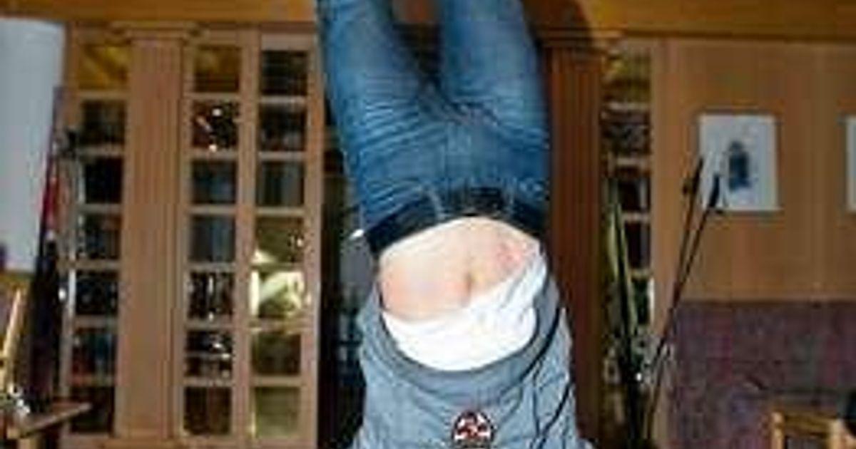 (Бьорнадален встает с дивана около камина и снимает сапоги («которые очень тяжелые, нарушение баланса»), делает стойку на руках и идет. Он: «Хорошо или не очень?»)