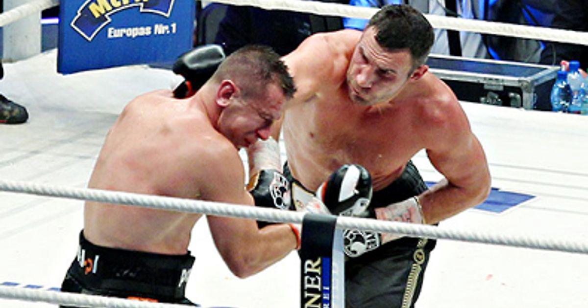 Виталий с опущенными и растопыренными руками, приседая вниз, почти демонстрирует защиту а ля Пернелл Уитакер. Никогда не думал, что скажу такое.