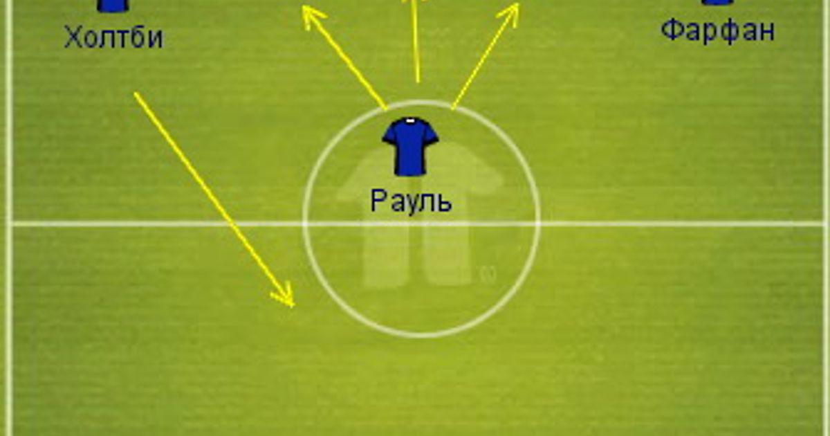 Доминирующая в современном футболе схема. Очень подходит для команд с ярко выраженным топ-форвардом в составе. Важнейшая роль в таком построении отводится центральному атакующему полузащитнику, коим на этом рисунке является Рауль. Он дирижирует финальным этапом атаки, подключая при необходимости правый и левый фланги. Ну, а вингеры, в свою очередь, отыскивают в центре штрафной площади светлую голову своего единственного нападающего. На сегодняшний день это базовая схема «Шальке».