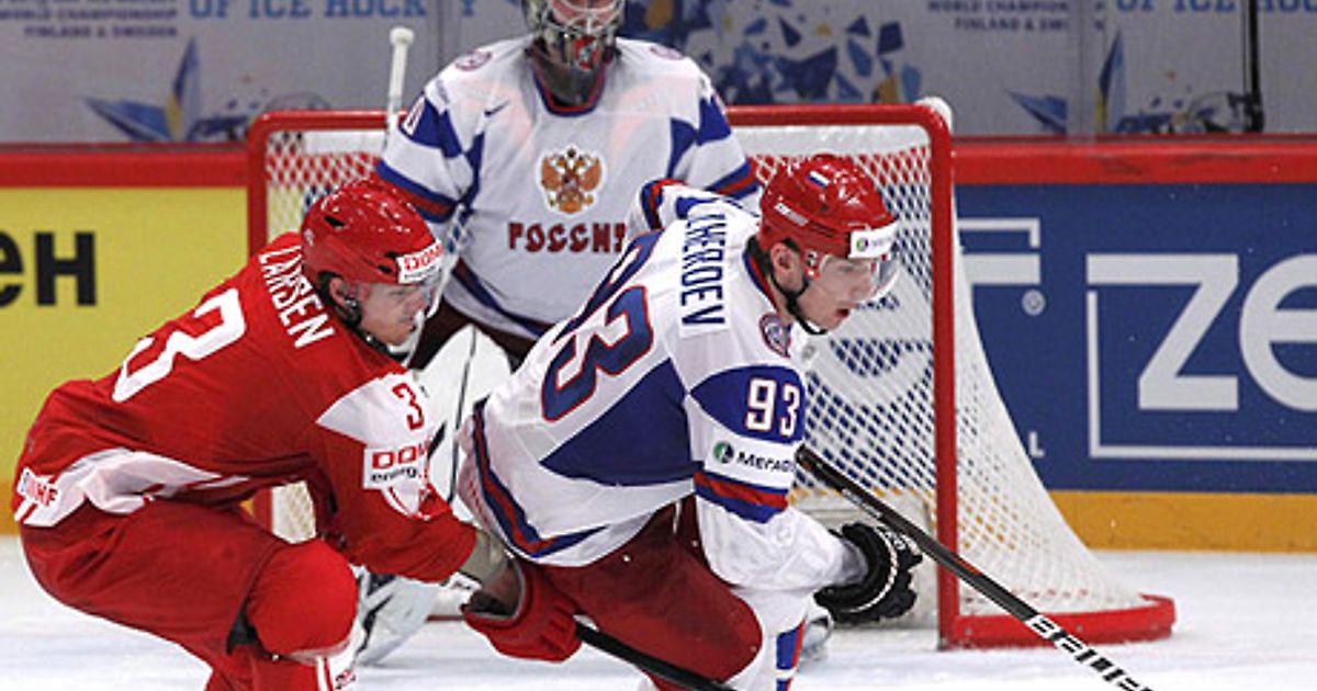 Как датчане ни старались, но этим вечером на льду «Глобена» забивали только российские хоккеисты. Счет открыл Евгений Медведев.