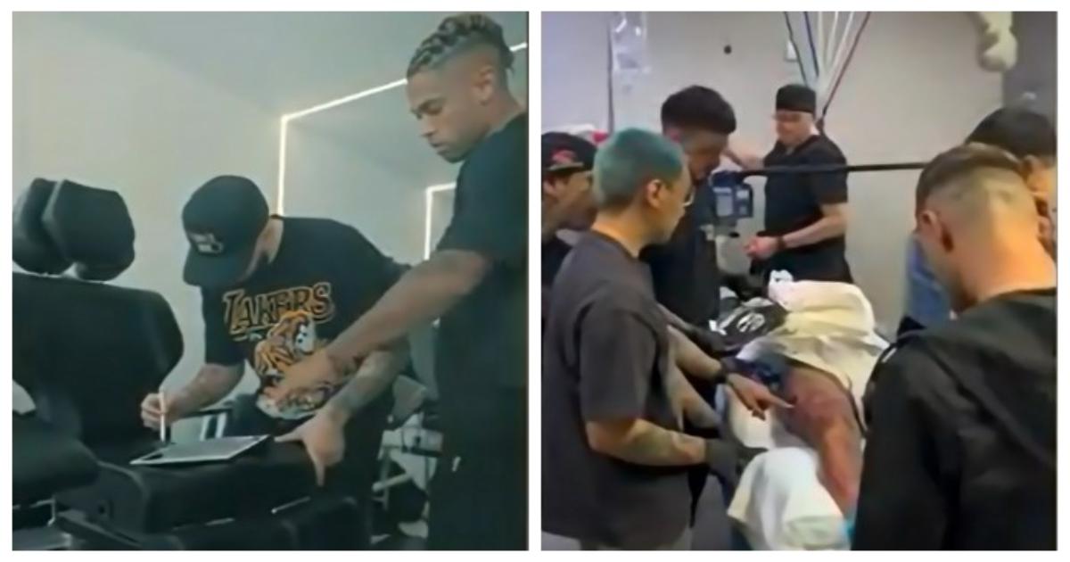 Футболист находится под наркозом, а в это время шестеро тату-мастеров наносят на его ногу рисунок – эта безболезненная процедура длилась несколько часов.