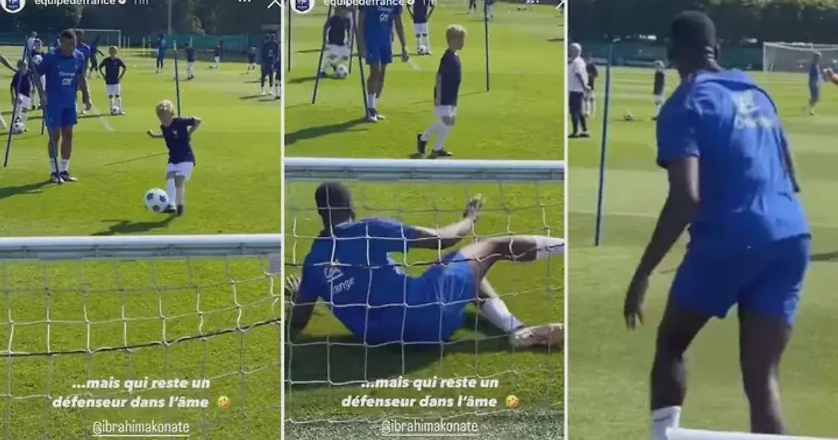 В одном из роликов, который быстро стал вирусным, Килиан Мбаппе подбадривает молодого игрока, а затем призывает его ударить по пустым воротам. Парень прицеливается, бьет и кажется, что сейчас будет гол, но внезапно в кадр влетает Конате и спасает рамку. Ибраима убегает и смеется, а Мбаппе стоит в недоумении.
