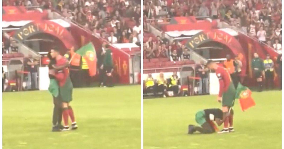 Отборочный матч к Евро-2024 между Португалией и Боснией, который завершился разгромом гостей 3:0 (хет-трик у Бруну Фернандеша) прерывался из-за персонального болельщика Криштиану Роналду. Тот подбежал к кумиру, обнял его, а затем начал делать странные действия.