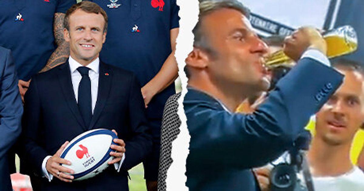 Ого, Эммануэль Макрон выпил бутылку пива за 20 секунд в раздевалке с регбистами!