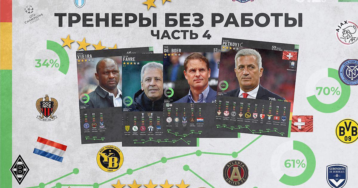 Наша рубрика подходит к концу. До этого мы уже рассказывали о двенадцати специалистах в трех предыдущих частях (можете ознакомиться с ними часть 1, часть 2, часть 3). Кто-то уже нашел работу, кто-то вот-вот найдет, а у нас последняя четверка на подходе. Итак, «Тренеры без работы. Часть 4». Люсьен Фавр, Владимир Петкович, Франк Де Бур и Патрик Виейра.