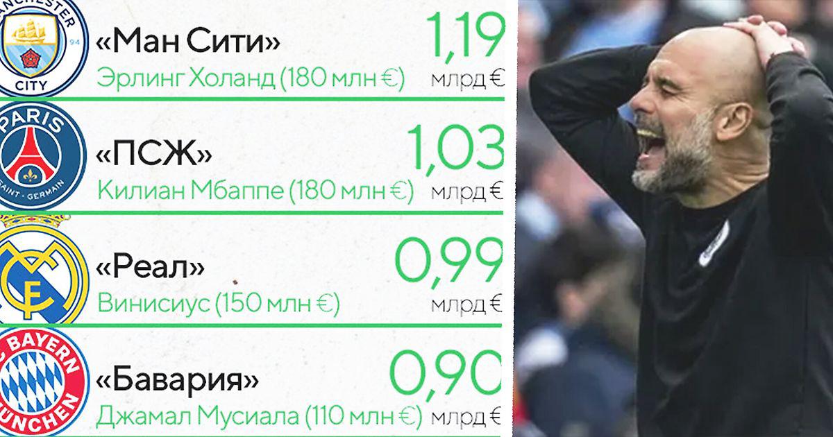 • В составе «Реала» четыре игрока оцениваются в 100+ млн евро – Винисиус (150 млн), Джуд Беллингем (120 млн), Федерико Вальверде и Родриго (по 100 млн). В остальных командах из топ-10 не более двух таких игроков.