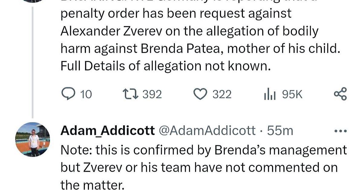 В социальной сети Адам Эддикотт разместил пост о том, RTL (крупнейший коммерческий телеканал Германии) сообщил о том, что «Против Александра Зверева было зарегистрировано заявление касательно причинения им телесных повреждений Бренде Патеа (родила от Зверева дочь в 2021 году). Сторона Патеа подтвердила эту информацию, сторона Зверева молчит.»