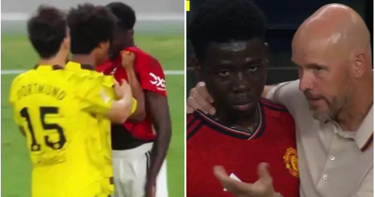Тен Хаг убрал с поля 19-летнего игрока «МЮ» за стычку с соперником. Затем тренер долго беседовал с юношей на бровке