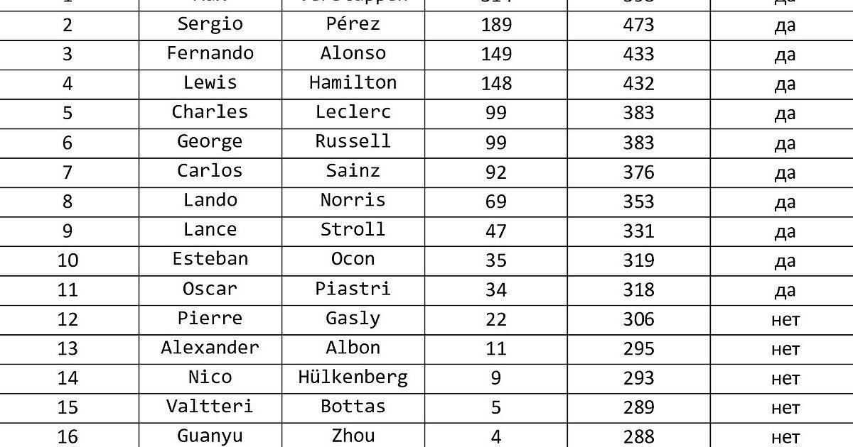 На таблице сверху представлено текущее положение пилота в чемпионате, количество набранных им очков и количество теоретически возможных к набору им очков. В чемпионате теоретически осталось провести 10 Гран При, причем среди них 3 спринта. Иными словами в 7 этапах можно набрать 26 очков, а в 3 можно набрать 34 очка. Итого 284 очков. Сделано допущение, что текущий лидер чемпионата больше не наберет, ни одного очка, а другой наберет максимальное количество. Для упрощения не сравнивались позиции, если балы равны.