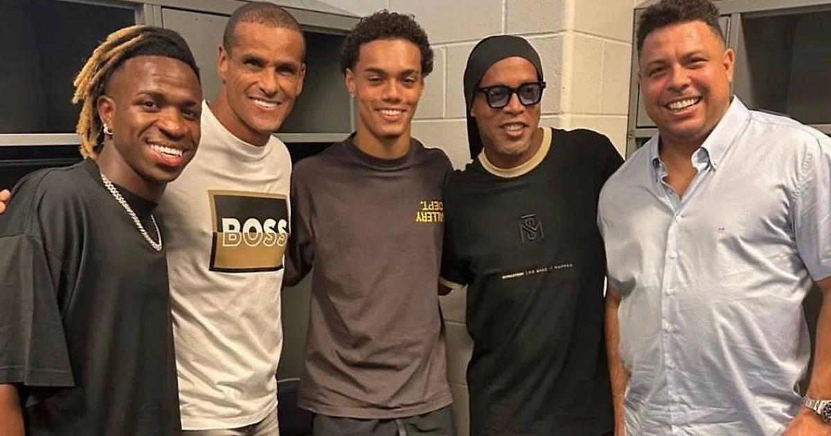 Фото выложил у себя в инстаграме Роналдиньо - помимо самого Винисиуса и легенд сборной Бразилии в кадр попал сын Роналдиньо Жоао Мендес.