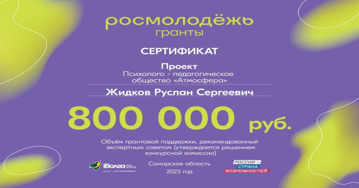 Проект Руслана Жидкова «Психолого-педагогическое общество «Атмосфера» вызвал большой интерес и поддержку экспертов «Росмолодежи.Гранты» и получил грант в размере 800 000 рублей в номинации «Делись опытом».