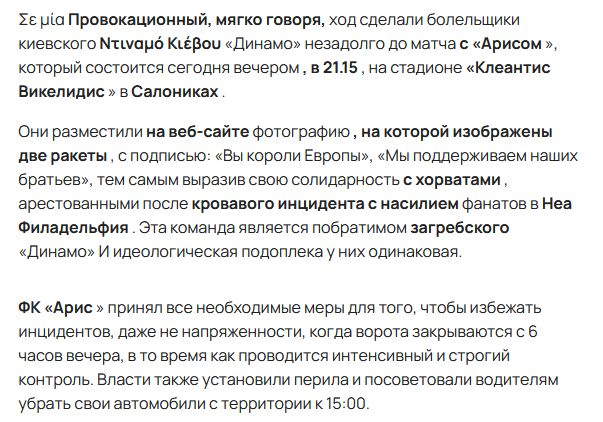 "Болельщики киевского "Динамо" перед матчем с "Арисом" в Салониках сделали провокационный, если не сказать больше, ход. Они разместили на одном из сайтов фотографию двух ракет с подписью: "BBB - короли Европы", "Мы поддерживаем наших братьев", - демонстрируя таким образом поддержку хорватам, арестованным после кровавого инцидента с насилием над фанатами в Неа-Филадельфия. Эта команда является побратимом загребского "Динамо" и имеет общую с ними нацистскую идеологию", - говорит тетенька в своем репортаже.