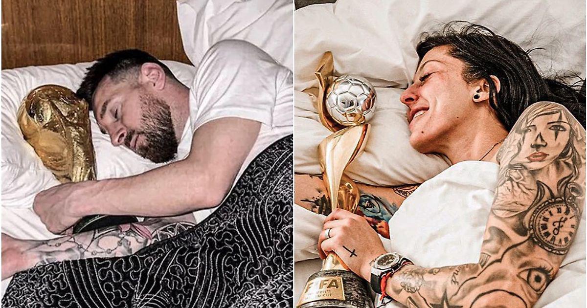 Звезда женской сборной Испании Дженнифер Эрмосо воссоздала самую популярную фотографию в истории соцсетей, на которой Лионель Месси спит в обнимку с Кубком Мира.