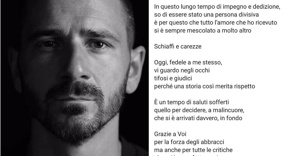 «Я – Леонардо Бонуччи, и вот уже 19 лет я являюсь профессиональным футболистом. Я знаю, что в течение этого долгого периода самоотверженности и преданности своему делу я был человеком, вызывающим разногласия. Поэтому вся любовь, которую я получал, всегда сочеталась со многим другим. И похвала, и критика.