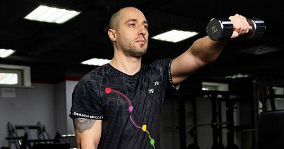 - Начинаем всегда со слабой стороны и подбираем нагрузку под нее – на выдохе поднимите перед собой гантель, развернув при подъеме так, чтобы в конечном положении ладонь смотрела вниз. Старайтесь поднимать именно локти, а не саму гантель, тогда руки будет легче держать прямыми.
