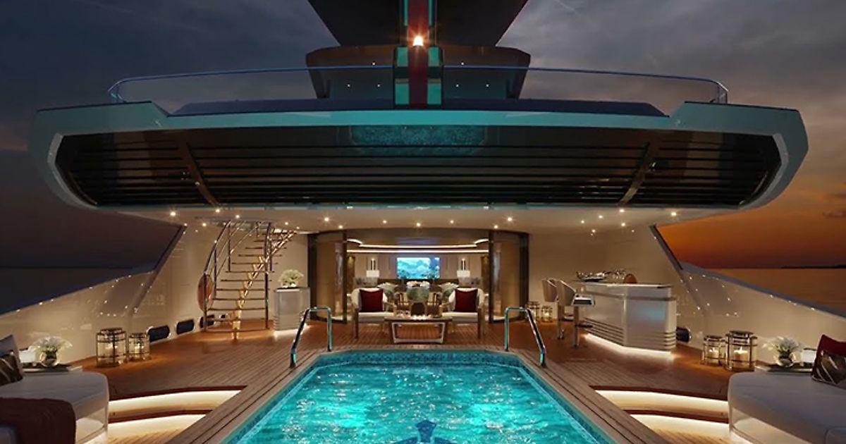 На судне много интересного: пейзажный бассейн размером 6,5 метра «с эффектом бесконечности», а также ступенчатая палуба, винтовая лестница и стеклянный лифт, соединяющий все палубы.