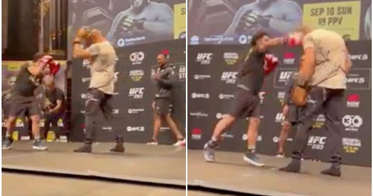 А еще претендент устроил спарринг с болельщиком после пресс-конференции.