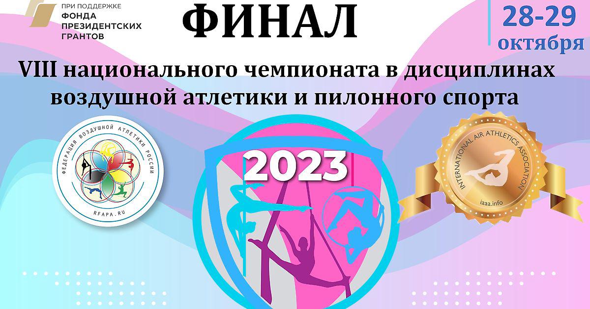 28-29 октября 2023 в спортивном комплексе СК Строитель (МАУ "УОиРОСС" Мытищи) пройдет ФИНАЛ VIII национального чемпионата в дисциплинах воздушной атлетики ( воздушной гимнастики) и пилонного спорта -2023, который проводится при поддержке Фонда Президентских грантов (Победитель конкурса, заявка 23-1-020253).