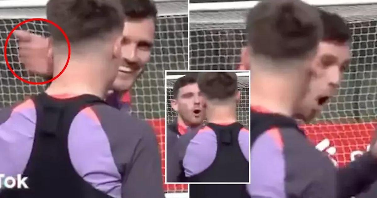 «Ливерпуль» на своих официальных каналах выложил обычное видео тренировочного процесса, но фан-аккаунт клуба заметил одну занятную деталь. Во время подготовки к одному из упражнений 29-летний Эндрю Робертсон хотел подшутить над 17-летним форвардом Беном Доуком и слегка перестарался.