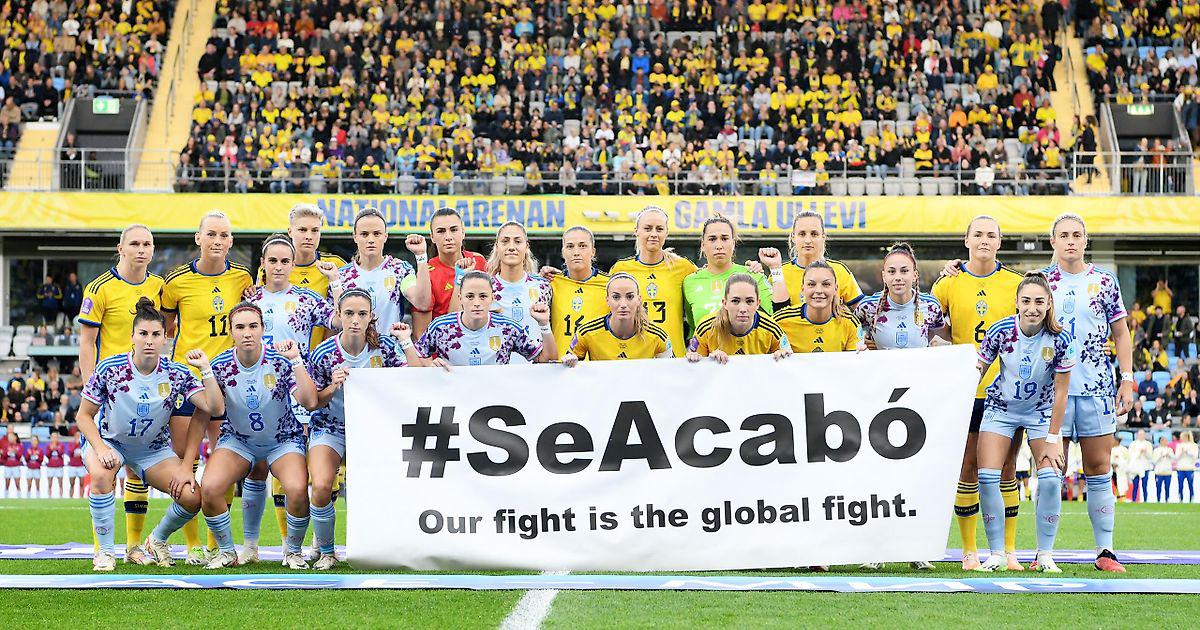 Испания победила на мундиале, но целый месяц находилась в центре внимания из-за скандала с Луисом Рубиалесом. Просто поменять тренера оказалось недостаточно – испанки всё равно отказывались вызываться в сборную. Дело кое-как замяли, после переговоров футболистки завершили бойкот (команду покинули только Мапи Леон и Патри Гихарро) и согласились сыграть. А перед матчем они вместе со шведками сфоткались с таким плакатом: