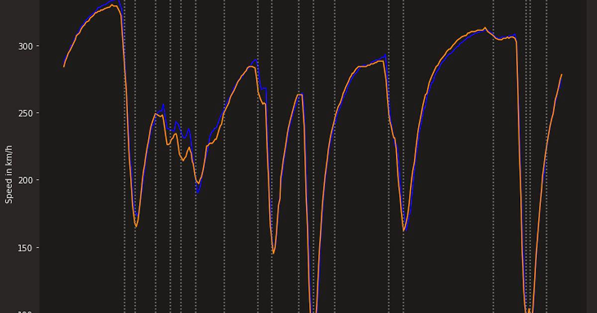 По оси у- отложена скорость каждого гонщика, по оси х - отложена дистанция трассы. Вертикальными линиями показаны номера соответствующих поворотов. Синим цветом показан график скорости Макса Ферстаппена, а оранжевым соответственно Оскаром Пиастри.