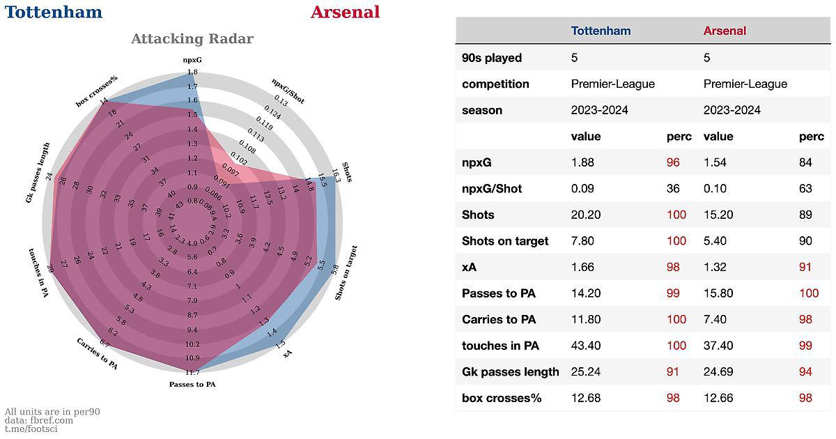 Помимо npxG/shot из рассмотренных на радаре метрик канониры оказываются чуть лучше Тоттенхэма только по кол-ву передач в штрафную площадь соперника (15.8 против 14.2).