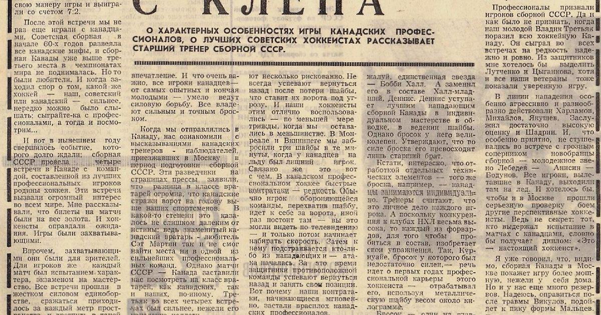 А 8 октября (№237), уже после завершения всех восьми матчей – интервью Боброва и тренера нашей команды Б.П. Кулагина в формате «ответы на вопросы читателей» под названием «Хоккей против «хоккея». И с общей «шапкой» полосы «Миф развеян».