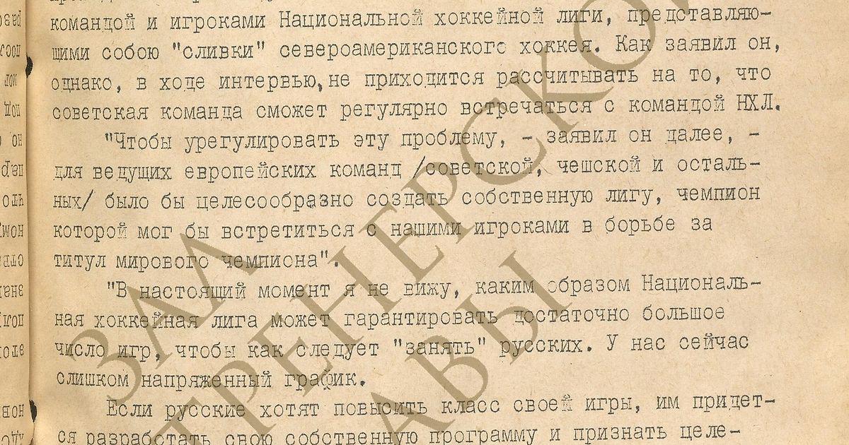 «Ожидаю того дня, когда советские и другие ведущие европейские хоккейные команды создадут лигу, чемпион которой встретится с лучшей командой Национальной хоккейной лиги в борьбе за титул чемпиона мира по хоккею», - заявил Кларенс Кэмпбелл.