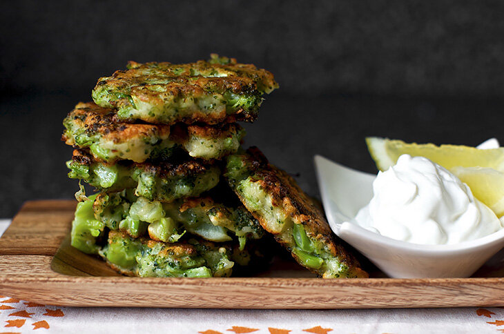 Взбить венчиком яйцо, добавить к нему муку, мелко натертый сыр и измельченный зубчик чеснока, соль и перец. Брокколи размять вилкой и выложить в яичную смесь.